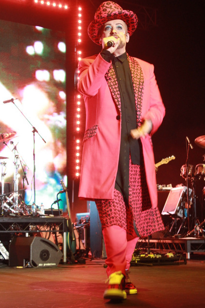 Boy George dazzled the audience appearing in a hot pink frock coat emblazoned with naughts and crosses, hugs and kisses. His signature hat perfectly matching the outfit.