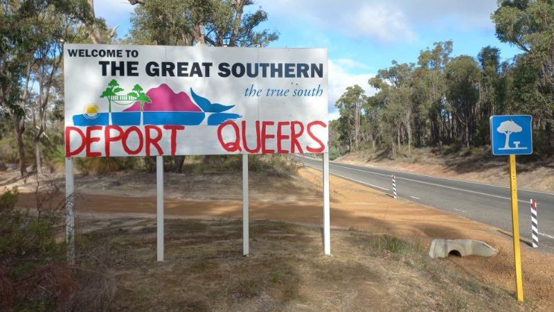 ‘Deport Queers’ was sprayed over a sign in the Muir Highway that welcomes people to the Great Southern region, one of Western Australia’s most popular tourist destinations.