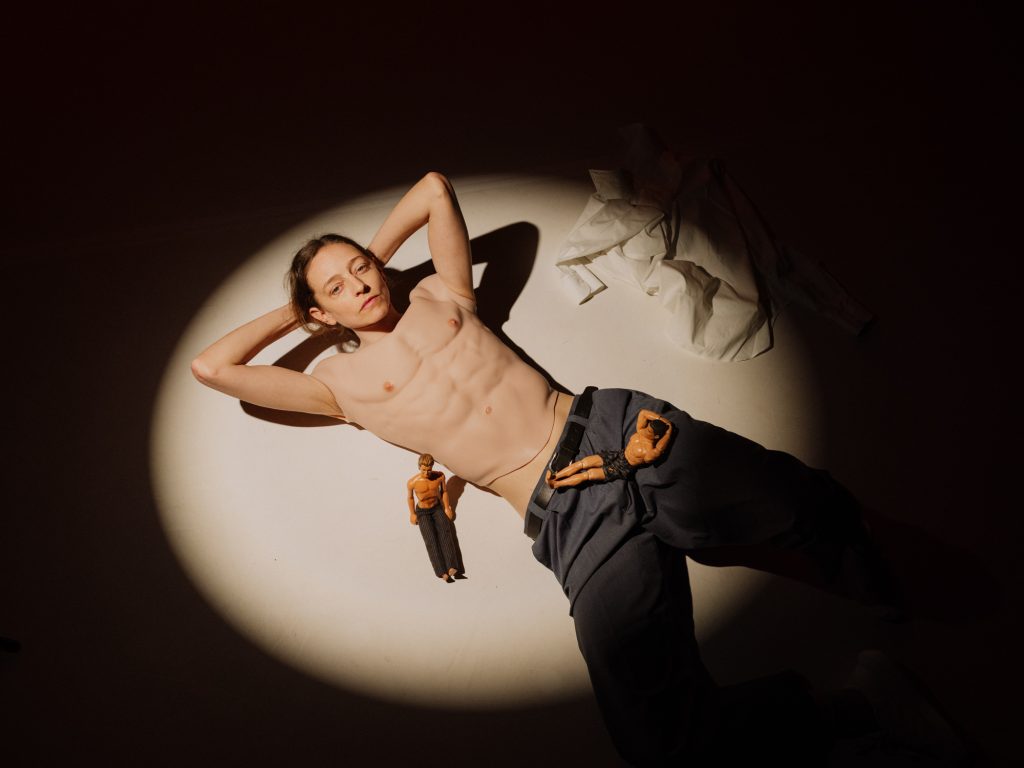 With silicone abs, shifting voices, and a highly physical presence, Orton explores vulnerability, identity, and the performative layers of gender.