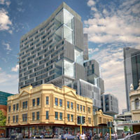 At 100 Saint Georges Terrace, at the back of the new Murray Street mall, an exciting new structure called Greenhouse is being built. Designed by Joost Bakker, it will be made entirely of natural, recyclable and reclaimed material, with awareness of a greater sustainability in mind. The structure is being made of recyclable steel frame, straw for natural insulation and the walls will be clad with terracotta pots of strawberry plants. Food will be served made from vegetables freshly grown in the rooftop garden. Another new building, One40william Street, the massive structure being constructed across heritage space in the CBD, actually has a five star Green Rating.
