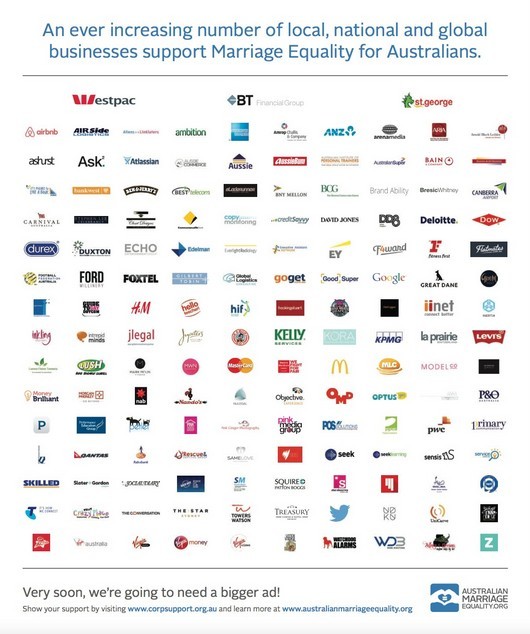 Two weeks since a full page advertisement showed corporate Australia’s support for LGBTIQ couples and families the level of support has trippled.