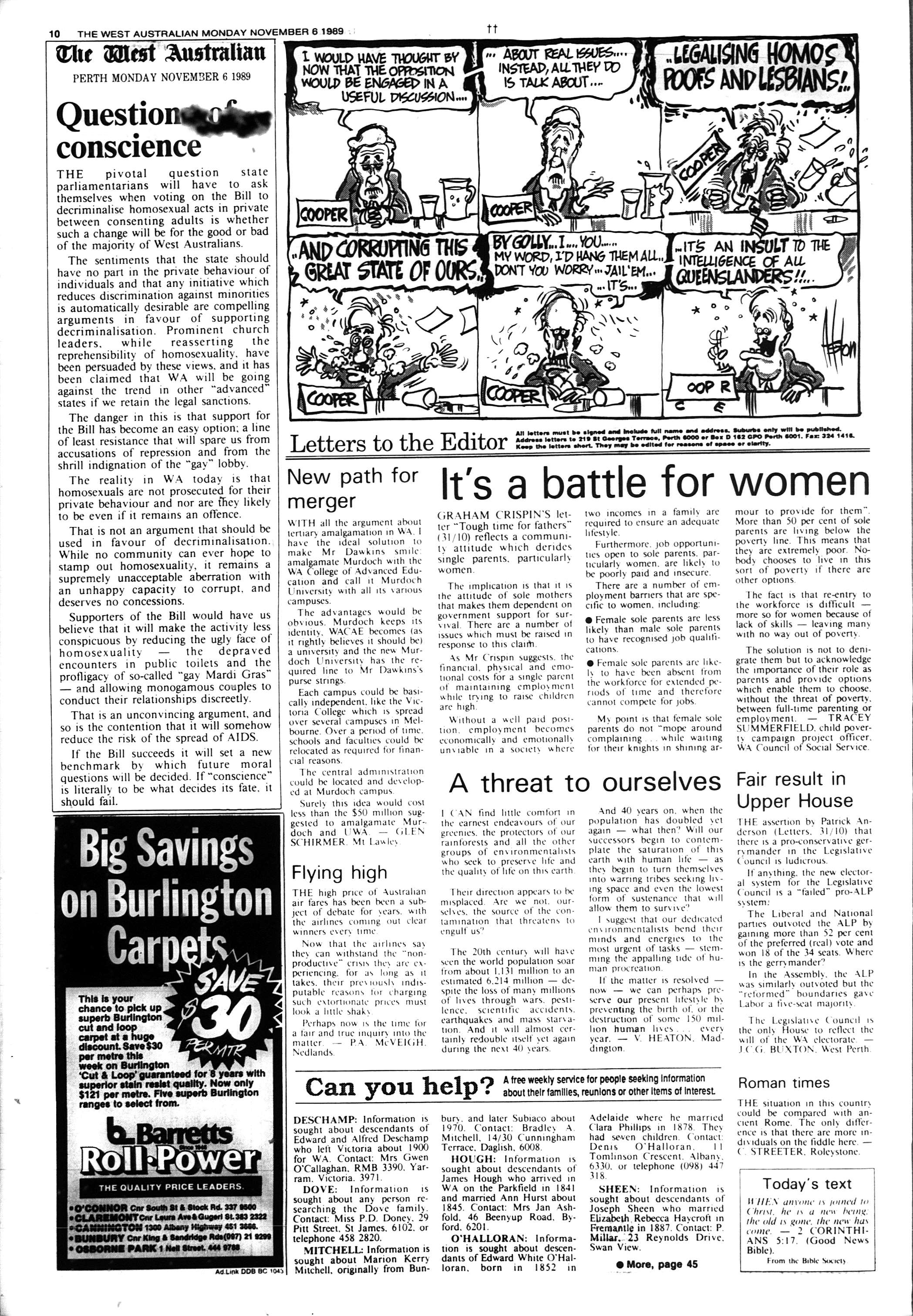 On Monday 6 November 1989, after weeks of debate, the Bill was expected to pass the upper house with amendments. That morning, The West Australian Newspaper ran an editorial to oppose it.