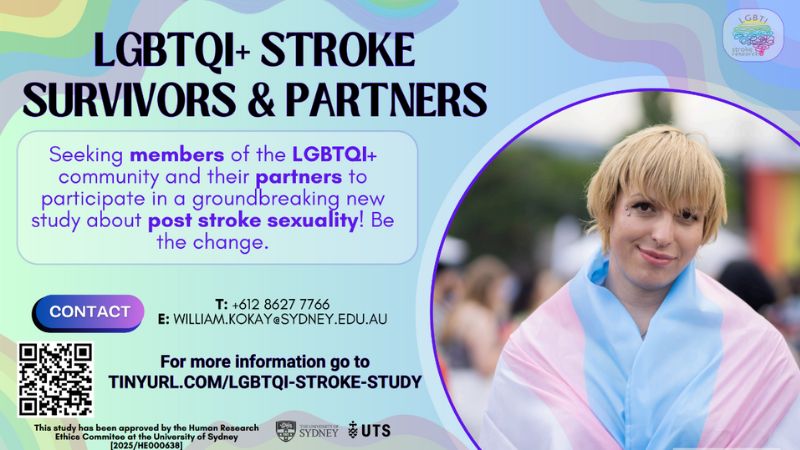 The study is open to people who are aged 18 years and older, living in Australia, New Zealand, USA, Canada or United Kingdom, who identify as lesbian, gay, bisexual, transgender, queer / questioning or intersex, and have experienced a stroke or are a partner of a person who has experienced a stroke.