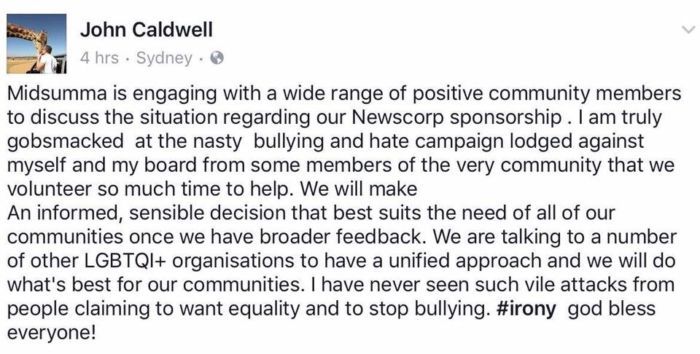 Midsumma has announced that they will be reviewing their sponsorship agreement with News Corp. The organisation said in a statement that they shared the communities concerns about opinion pieces published in News Corp’s suite of newspapers.