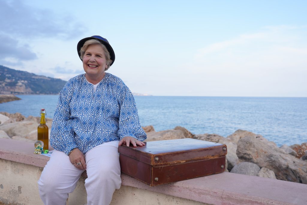 She meets winemakers and parfumiers and enjoys great food as she strolls the old towns, promenades and beaches of the Cote D’Azur. She also jokes about the excessive number of steps she has to climb as she works her way around the different town.