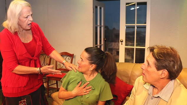 “They’re on a small thrust stage, right in front of the proscenium, with the remaining scenes in the living room of a hotel.”
