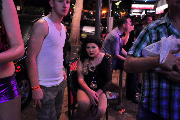 ‘One of the most popular images at the exhibition has been this shot taken out the front of Connections Nightclub early one morning, featuring the fabulous drag performer Lindsay No Hands. I think this photo works really well in an exhibition because there is a lot of things to look at in the image. After the opening night last week we also know a little bit more about the photo because the man in the checked shirt holding the plastic bag recognised himself!’