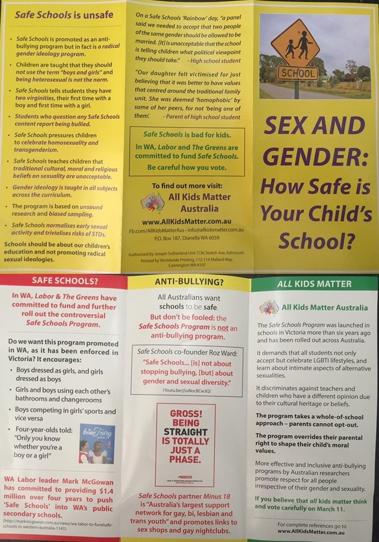 “Tens of thousands of flyers have been distributed across Perth ahead of the WA state election. The Safe Schools program continues to be a Trojan horse that advocates an anti-bullying message but drives a real program of gender theory indoctrination,” Parker said.