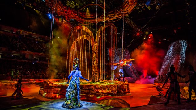 The show features massive video projections that changes the landscape of the space from forest to water and fire. The performance begins with a narrator standing high on a mountain, that grows before us, inviting us into the world created in James Cameron’s film Avatar.