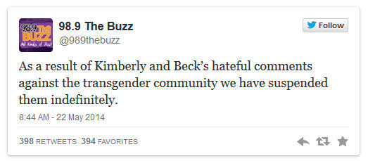 “Their hateful comments against the transgender community do not represent our station or our company. We deeply apologize to the transgender community, the community of Rochester, and anyone else who was offended by their comments. We are proud of our past work on behalf of the local LGBT community and we remain committed to that partnership.”